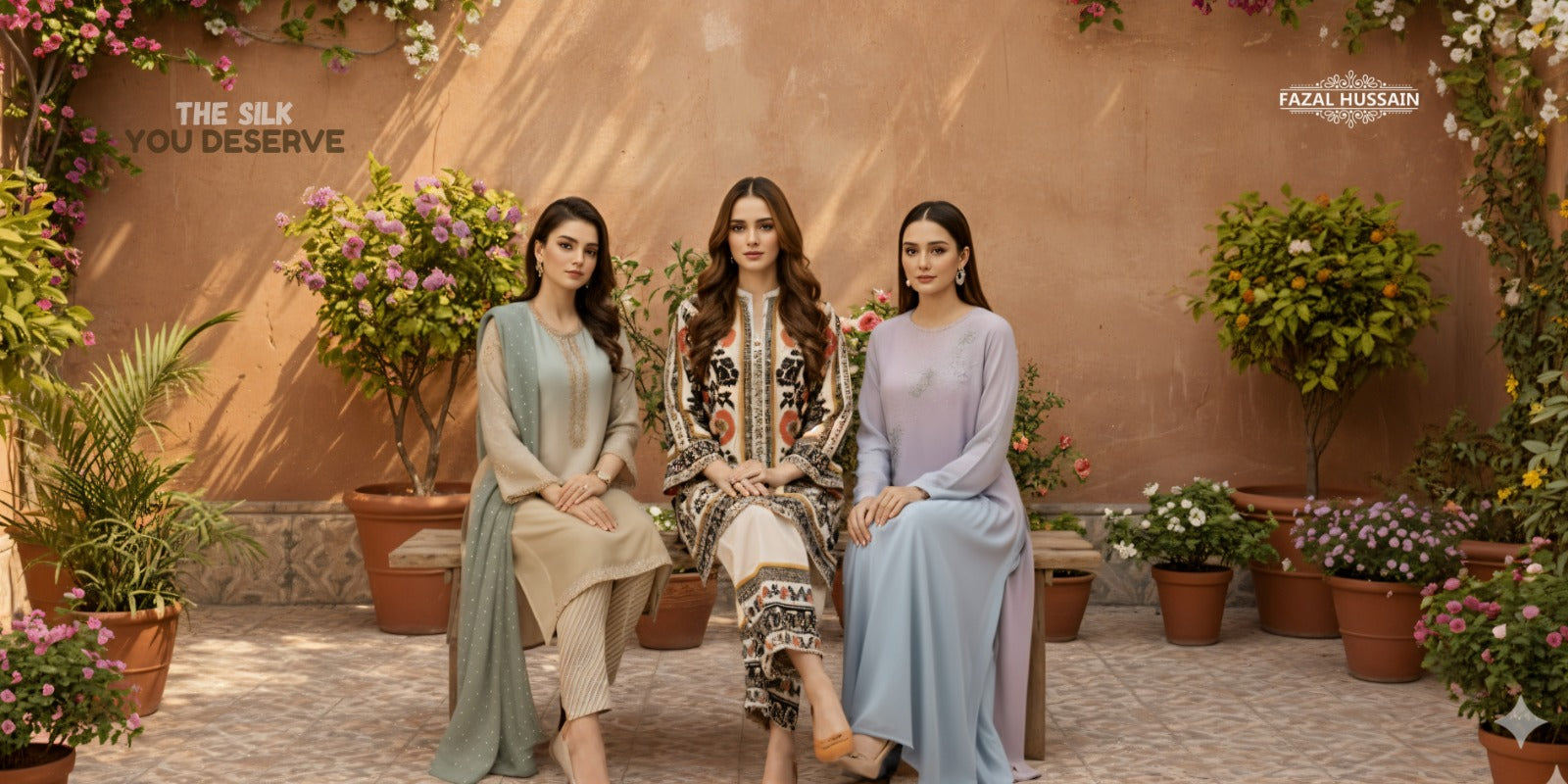Indulge in pure luxury with our Silk Collection, a perfect blend of elegance and sophistication. Each outfit is tailored from premium silk fabrics, featuring rich textures, graceful drapes, and exquisite embroidery that exudes timeless charm. Ideal for festive gatherings, formal events, and evening occasions — elevate your look with the unmatched allure of Fazal Hussain Silk.